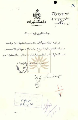 La demande officielle auprès du ministre de la culture pour la signature validant l’ordonnance et la nomination du Dr. Mohsen Hachtroudi au poste de doyen de la faculté des sciences. (june 1, 1957)